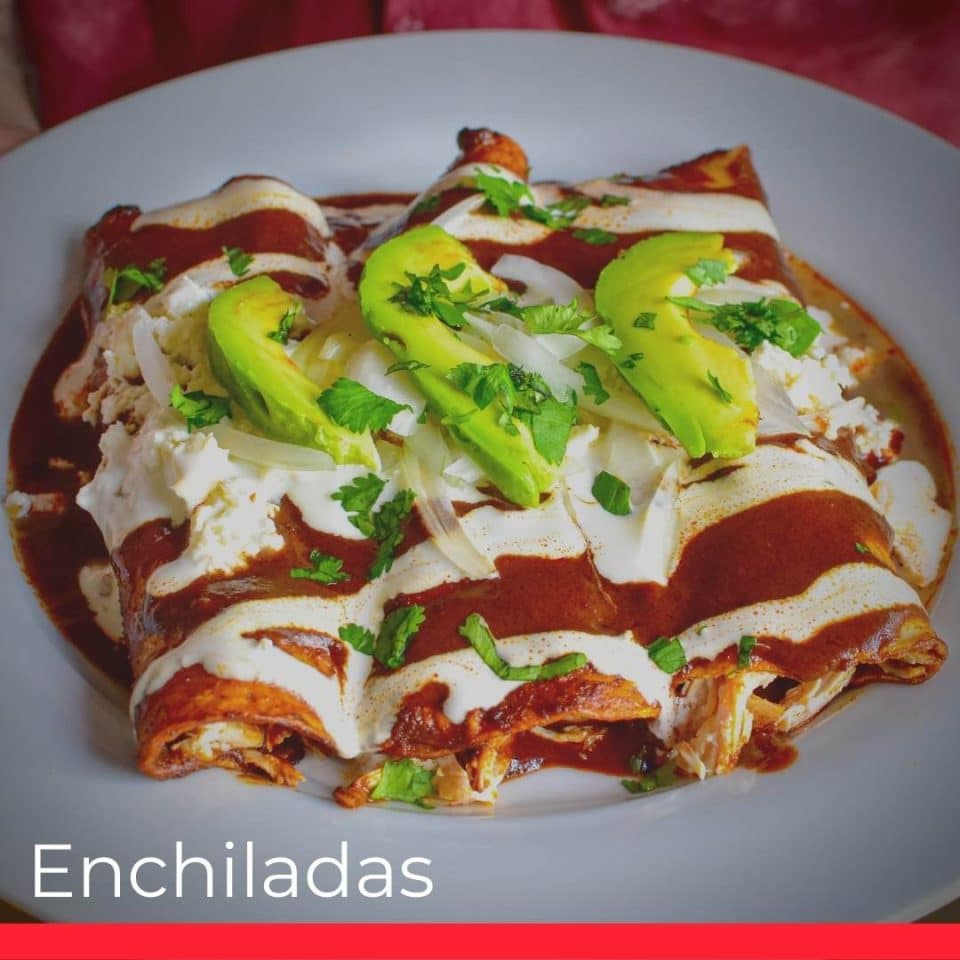 Enchilada comes from en-chili-ada—so always expect a spicy touch. They are served with sour cream, fresh cheese, onion, and celery.