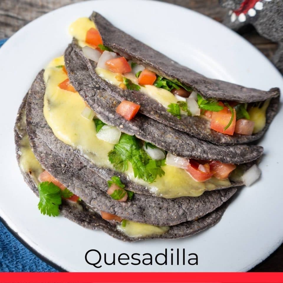 Quesadilla (Cheese-adilla) are corn or flour tortillas folded in half, usually stuffed with cheese and sometimes with other ingredients, which can be either deep fried or grilled. They are enjoyed hot and make a great breakfast or lunch.