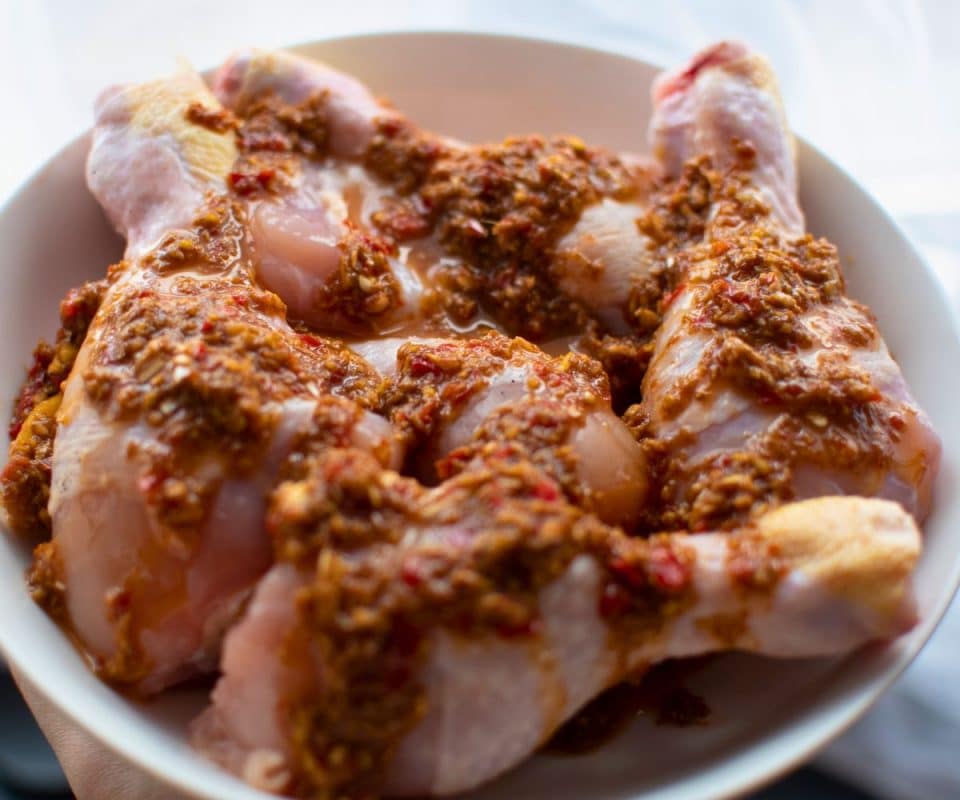 - In a bowl, generously coat the chicken drumsticks with the marinade. Cover the bowl with cling wrap and let it rest in the refrigerator for a minimum of 1 hour.