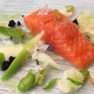 Star Anise Marinated Salmon with Flying Fish Ro & Cucumber Jelly
