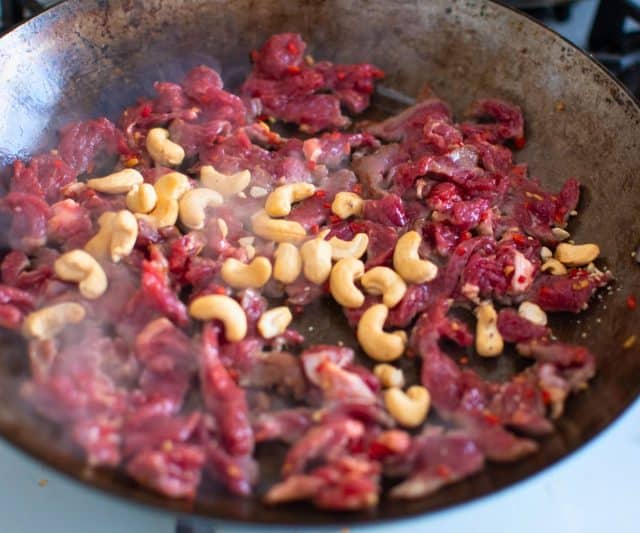 - When the rice is ready, heat a wok and quickly fry the ribeye with a little cooking oil on high heat. After browning the meat, add the cashews and bamboo shoots, and another teaspoon of soy sauce.
