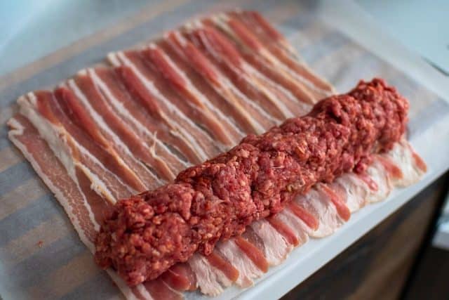 - On a baking sheet, place the bacon slices side by side and then add the beef and roll it tightly in the bacon using the baking paper. The roll can also be prepared a day in advance and stored in the fridge. The salt will act as a glue for the meat and it will be much easier to cut/handle.