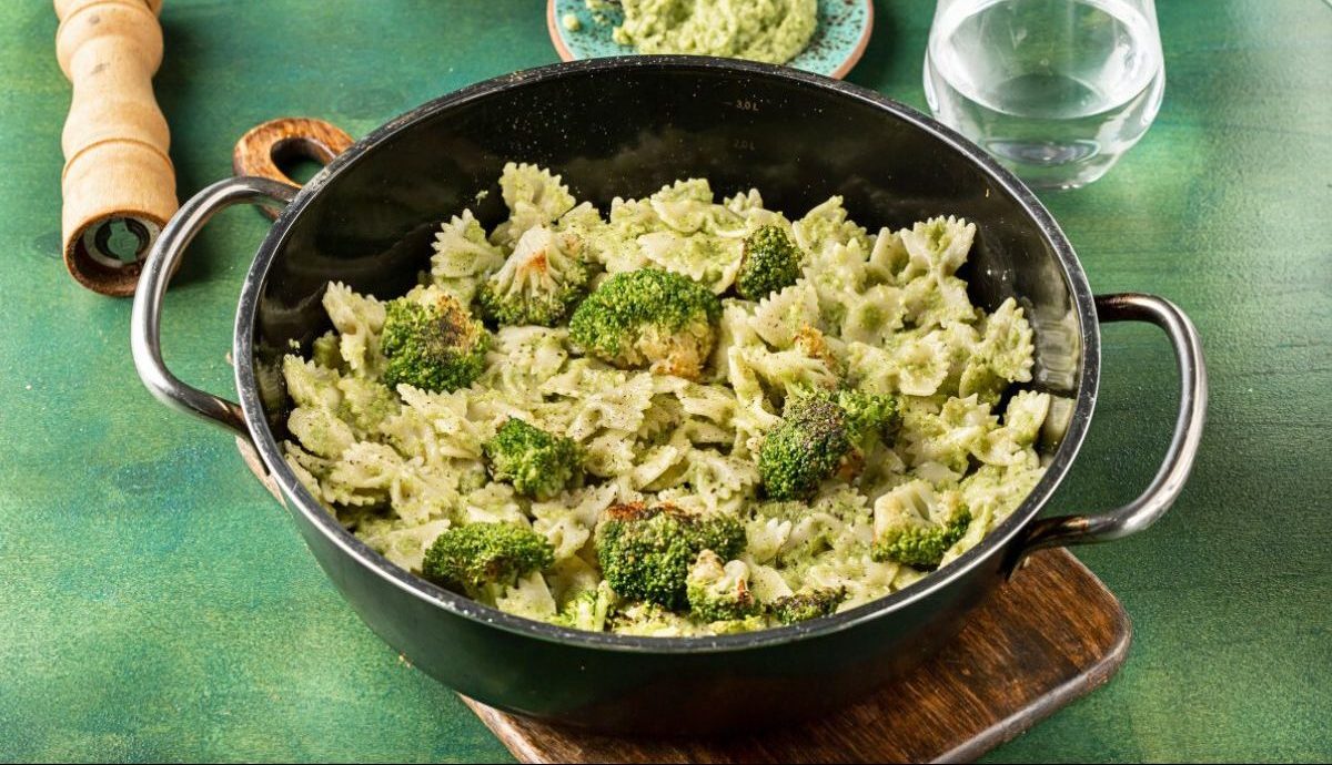 Remove the pan from the heat, add the broccoli pesto, water from the boiling pasta and the farfalle. Stir well and serve.