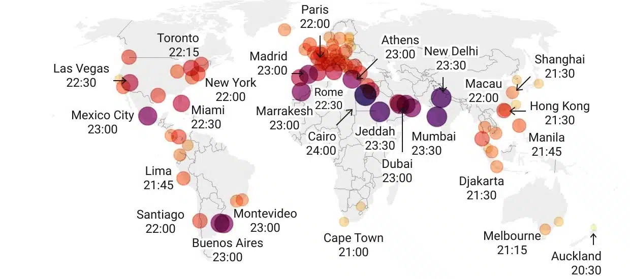 Our team has researched booking calendars for over 4,400 restaurants in 89 cities worldwide and identified the last seating (or last food order) at weekends for each of these restaurants.